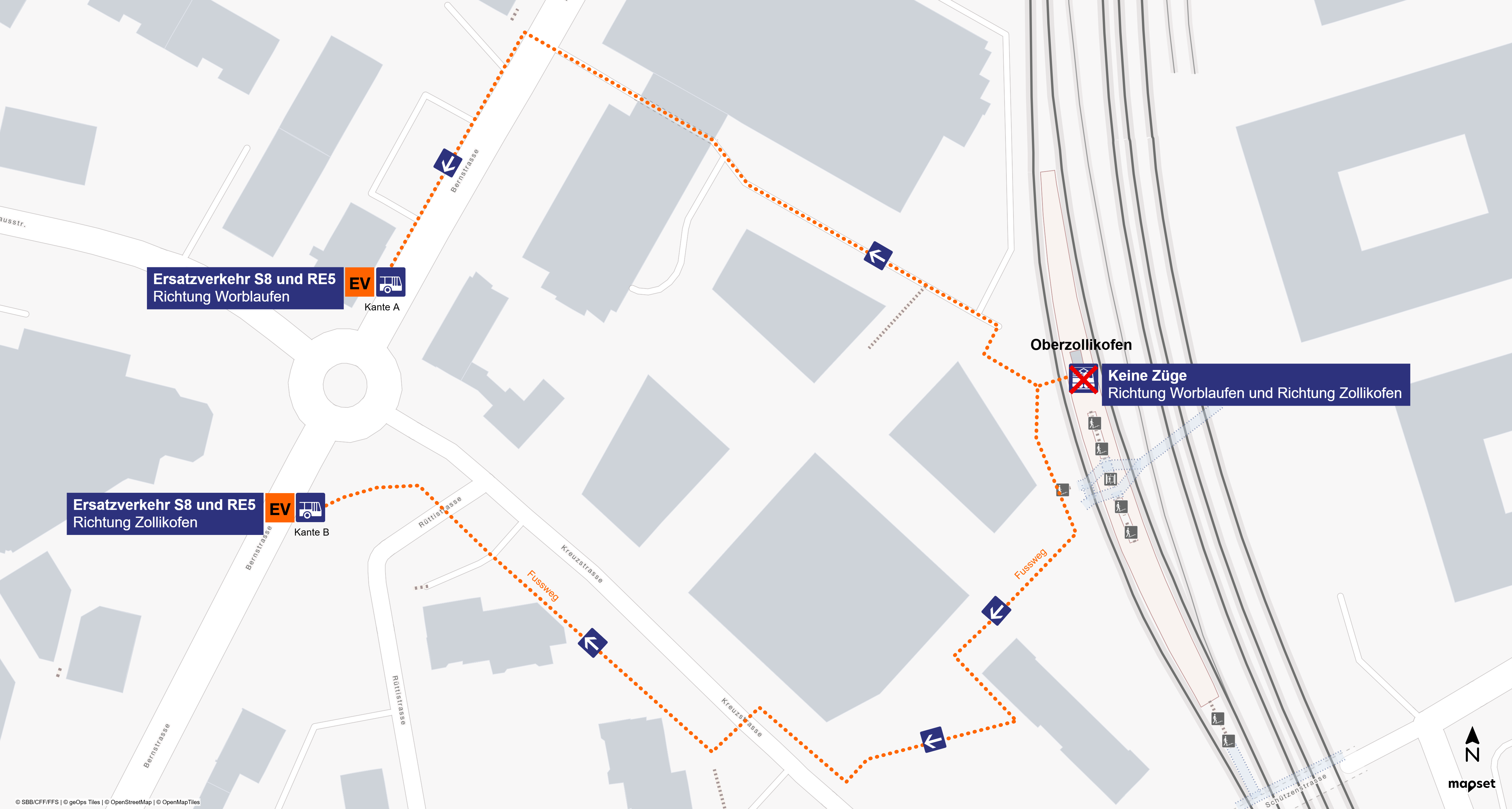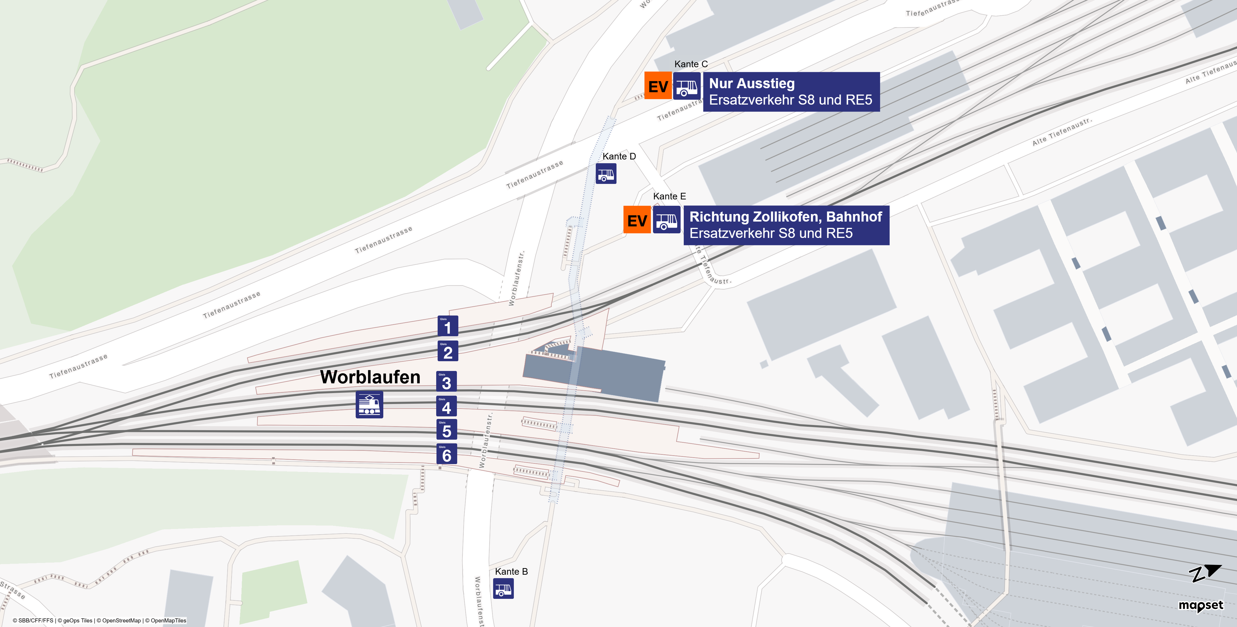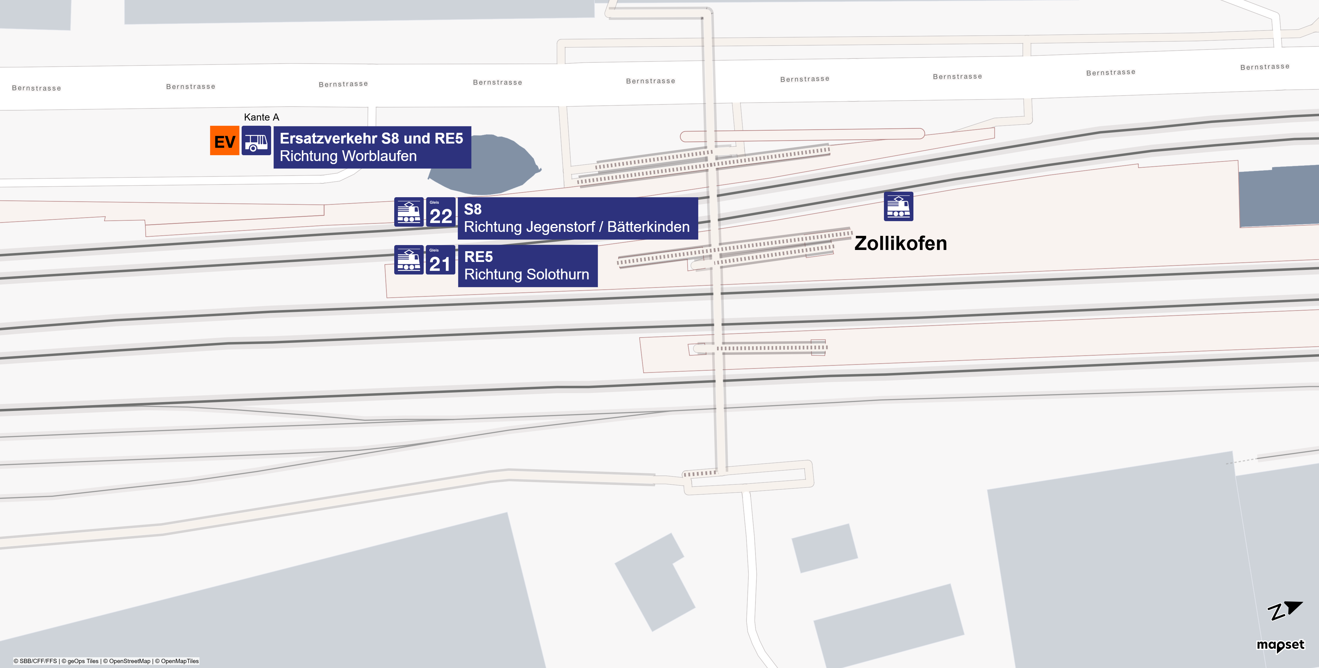 Der Bahnverkehr der Linien S8 und RE5 zwischen Worblaufen und Zollikofen ist von 17.04.2026, 05:00 Uhr, bis 20.04.2026, 01:30 Uhr unterbrochen. Es fahren Ersatzbusse (EV). Der Fahrplan ändert sich teilweise. Der Online-Fahrplan ist