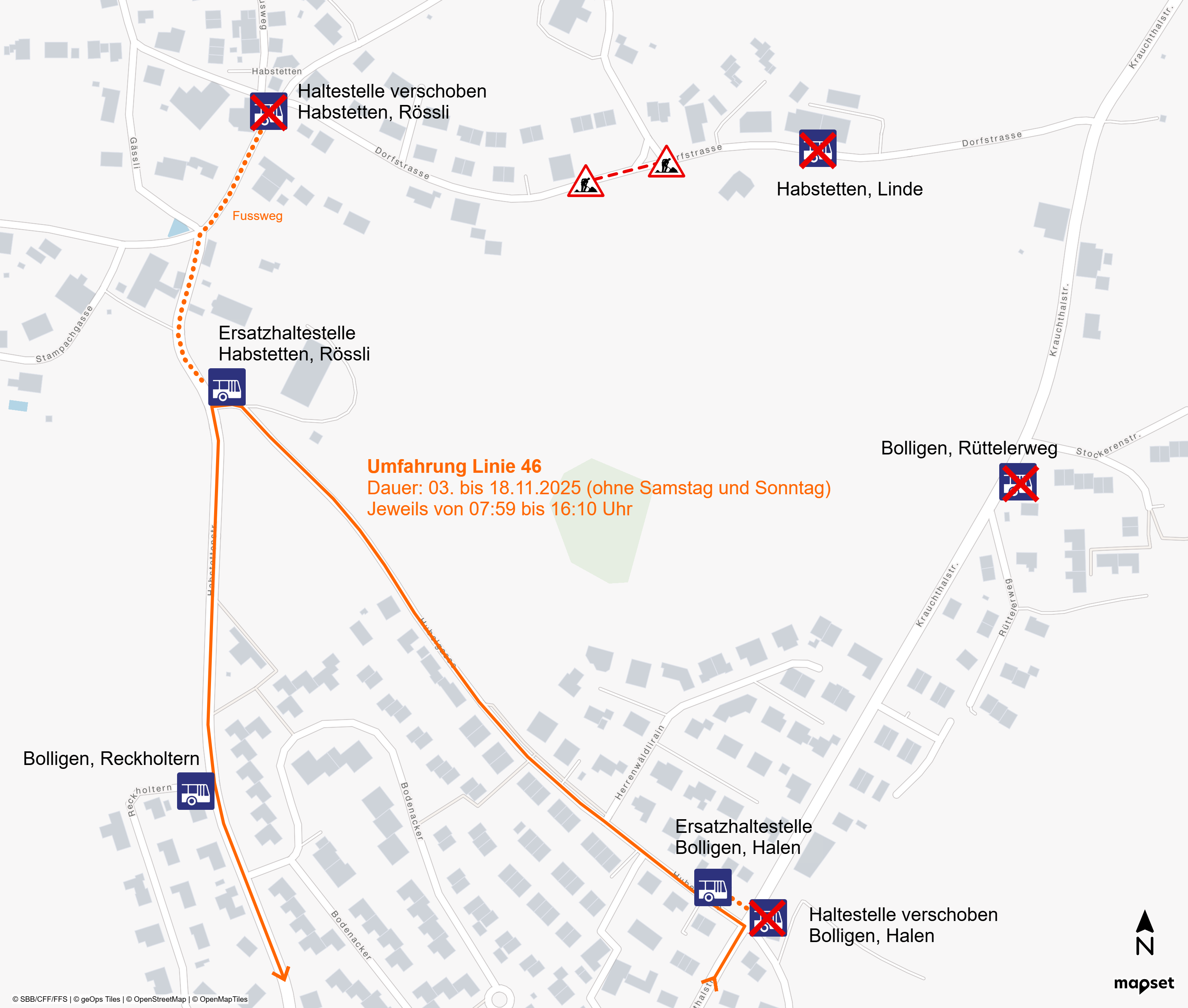 Die Linie 46 wird zeitweise umgeleitet. Die Haltestellen «Bolligen, Halen» und «Habstetten, Rössli» sind verschoben. Die. Haltestellen «Bolligen, Rüttelerweg» und «Habstetten, Linde» werden nicht bedient. Der Grund dafür sind Bauarbeiten. Die Einschränkung dauert von 03.11.2025,bis 18.11.2025, jeweils von 07:59 bis 16:10 Uhr. Bitte beachten Sie die Signalisation vor Ort.