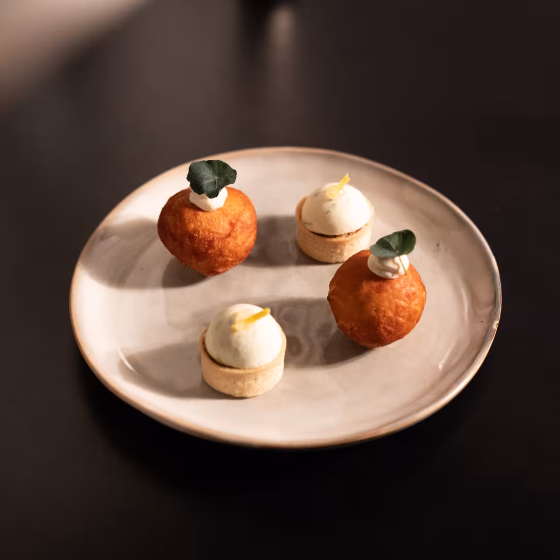 Knuspriges Tartelett, gefüllt mit einer gerösteten Blumenkohlcrème, einem Frischkäsemousse und Zitronengelee.
