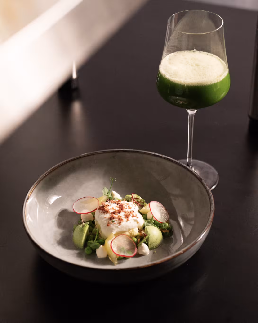 Dazu ein passender Cocktail aus aufgeschäumtem Gurkensaft und Matten Gin.